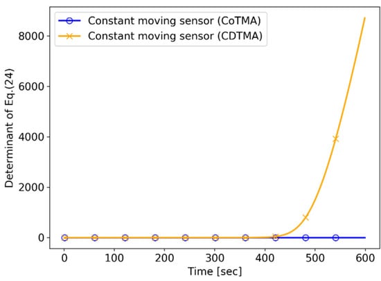 For , the Equation (45) is satisfied, even if the sensor performs constant velocity motion. Therefore, the sensor maneuver is not required under the CDTMA system. There is a significant difference between the CDTMA and the BoTMA in the 2D plane.
