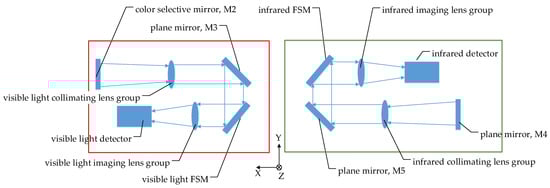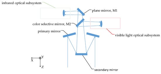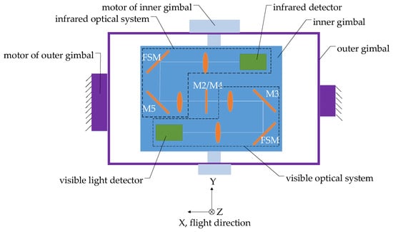 The dynamic scan and stare imaging system studied in this paper is composed of a two-axis gimbal, optical subsystem and electronic control subsystem, as shown in Figure 1. The gimbal is used to achieve the LOS pointing and expand the imaging FOV through scan motion. The optical subsystem is installed on the inner gimbal and adopts a visible light/medium infrared, dual-band, shared-aperture optical design, including a primary mirror, secondary mirror, color-selective mirror, visible light/infrared collimating lens groups, visible light/infrared imaging lens group, and mirrors used for turning the light path and 2 FSMs, as shown in Figure 2 and Figure 3. The electronic control subsystem is used to realize the motion control and imaging control, etc. The FSMs are used to compensate the image motion caused by the flight speed, attitude motion and the gimbal scanning. Although compensation can be achieved by using a two-axis FSM or two single-axis FSMs in each imaging subsystem, two two-axis FSMs are adopted, which are set in the visible light and infrared subsystem, respectively, due to the limited space.