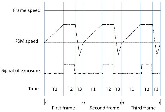 The timing/velocity relationships between the gimbal and the FSM, and the timing diagram of the exposure trigger signal during imaging is shown in Figure 5. The gimbal rotates continuously at a constant angular velocity during the work. Within one frame of imaging time, the FSM takes T1 time to accelerate to the compensation angular velocity, calculated by the command unit, to maintain stabilization. Then, the command system controls the detector exposure in T2 period. After one exposure, the FSM will return to the initial position within T3 time to prepare for the next exposure. Although FSM accelerates in both TI and T3 period, the T1 time is generally longer as the FSM has to reach a stable speed before the exposure. The acceleration of the FSM is greater during the T3 period. As the exposure time of infrared detector is longer (up to 20 ms) than the visible light detector, the T1 and T3 time of the infrared subsystem is shorter than the visible light subsystem when the imaging frame frequency is constant. So the requirement for the acceleration performance of the FSM in the infrared subsystem is higher.