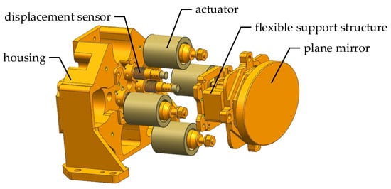 The IMC frequency is high as the dynamic scan and stare imaging system has a high imaging frame frequency. Therefore, it requires the compensation mechanism to have a high response speed, positioning accuracy and closed-loop bandwidth. Figure 6 shows the structure composition of the two-axis FSM. The FSM is mainly composed of a plane mirror, flexible support structure, actuators, displacement sensors, a housing and the controller. After being pushed and pulled by the actuators, the plane mirror produces a two-dimensional small-angle rotation, relying on the elastic deformation of the flexural hinges in the flexible support structure. The displacement sensors measure the displacement of the plane mirror in real time to realize the indirect measurement of the rotation angle. Then, the closed-loop control of the FSM can be completed.