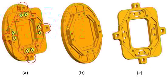 Since the mirror needs to be connected with the actuators and the flexible support structure, corresponding mechanical interfaces are reserved on the mirror. If the mirror is made of glass or SiC, it needs to be embedded in a mirror holder and the connection interface is designed on the mirror holder. This will lead to a complex structure and increase the weight and size of the FSM assembly. In order to avoid the mirror holder, RSA6061 aluminum alloys with excellent machinability are used to manufacture the mirror [40,41]. Threaded holes are machined directly onto the mirror to connect the actuators and flexible support structure. Due to the large linear expansion coefficient of the aluminum alloy, which is much different from the modified layer on the mirror surface, the bimetallic effect is easy to occur when the temperature changes. Additionally, it results in the reduction in surface profile accuracy. Therefore, the surface of the mirror is not plated with the modified layer. The mirror is polished directly on the aluminum alloy surface until the RMS error is better than 18 nm. The outline of the mirror is shown in Figure 7. In order to simplify the facilitate processing and optimize the force transmission path, the mirror was divided into two parts, the mirror body and the backplane. The two parts were connected together with eight screws before mirror polishing was carried out. Both the mirror body and the backplane were designed with lightweight grooves and stress relief holes. The thinnest position of the mirror body was only 3 mm and the total thickness was 16 mm after the mirror body was connected with the backplane. The total weight of the mirror was 82 g. The flexible support structure was connected with the mirror through the threaded hole (marked with red rectangulars in Figure 7a), and the field assemblies of voice coil motors were connected with the mirror through four cylindrical holes (marked with red circles in Figure 7a). The structure stress generated by the connection process and the self-weight of the motors was not transmitted to the mirror due to the stress relief holes of the backplane and the mirror body.