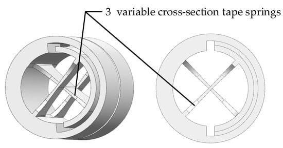 The cross axis flexural hinges are specially developed for this FSM, as shown in Figure 12, with a diameter of 5 mm, an angle range of ±3.5 ° and a torsional stiffness of 0.0008 . Different from the cross axis flexural hinge shown in Figure 10, three variable cross-section tape springs are used. The thickness of the thinnest position of the tape spring is 0.11 mm, which is half that of the thickest position.