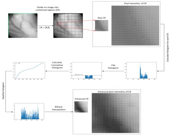 Contrast limited adaptive histogram equalization (CLAHE) algorithm was used as the first technique for enhancing the contrast between veins and the background. The detailed step of the CLAHE algorithms are explained as follows []: