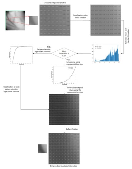 As already known, image characteristics such as brightness, darkness, and boundary, are fuzzy in nature. Hence, the fuzzy domain is a good alternative, especially to the conventional approaches []. Fuzzy domain is able to improve the brightness of both local and global-based images as it can brighten the surrounding by having uniform density. Researchers of work [] proposed fuzzy histogram hyperbolization (FHH) in blood vessels in the retinal image and have succeeded in improving the contrast. In another work, the authors of [] employed a sequence of CLAHE and FHH to improve dorsal hand vein images. Although FHH is able to provide better vein or vessel enhancement, it highly depends on the selected membership function and the value of the hedge factor, β. When a selection of β reaching 0, it will produce bright images, and when β reaching ∞, it will produce dark images. On the other hand, FHH also has the common problem with conventional gamma correction, which requires experience for selecting the hedge factor, β. Sometimes, it will end up with over-enhancement or under-enhancement problems.