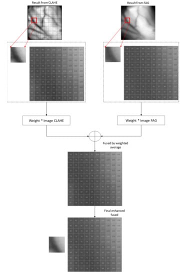 The first two terms of Equation (9), are the weighted average of these two images, which affects the energy of the fused image while the last term, is the weighted difference of these two images. The weighted difference is added to balance the weighted average. This improved weighted averaging fusion generated a fused function of CLAHE and proposed FAG. The flow diagram for the proposed improved weighted average fusion is illustrated in Figure 4.