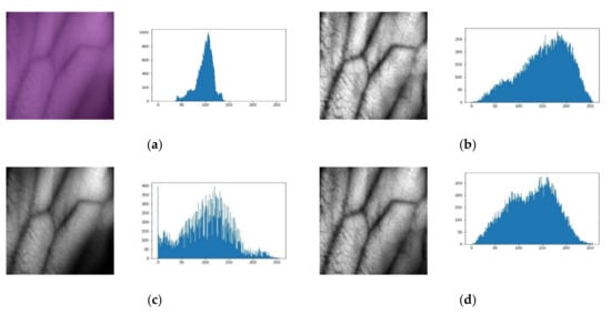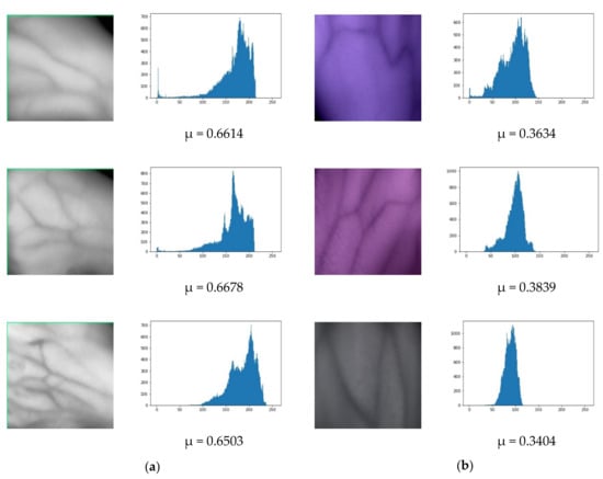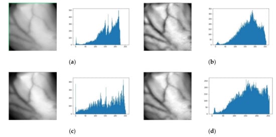 Figure 5a,b shows samples of hand vein images and their corresponding histograms from self-acquisition and SUAS databases. As can be seen, the hand vein images in Figure 5a are brighter than Figure 5b, and their corresponding histograms are accumulated within a minimal range and tilted towards the right side. With mean intensity greater than 0.5, the self-acquisition database’s hand vein images are considered as bright images. On the other hand, vein images from Figure 5b are darker, and their corresponding histograms are accumulated within a minimal range and are tilted towards the left side. With a mean intensity of less than 0.5, the SUAS database is considered as dark images.