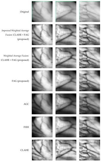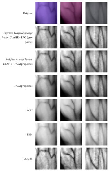 Many previous studies have developed different enhancement methods for vein images to overcome the performance degradation of hand vein detection and pattern recognition [,,,,]. In general, these studies can be broadly categorized into standard image enhancement and fusion image enhancement.
