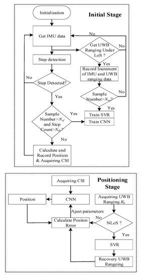 The whole system is divided into two stages: an initial stage and a positioning stage, as shown in Figure 1. In the initial stage, a tester equipped with an IMU sensor and a UWB tag (mounted tightly) starts from a fixed point (a known coordinate such as an entrance), and the initial stage consists of two parts: CNN training and SVR training. During CNN training, if the step is detected in the Step detection block using the IMU data, the system will calculate the current location and record position-related fingerprints when the sample number and step count are less than their threshold Nsf and Nth. It should be emphasized that the sample number Nsf is much larger than Nth, thus, if the step count reaches the threshold Nth while the sample number is insufficient, it should return to a fixed point to restart the PDR position calculation and fingerprint collection along a different test line until the sample number is satisfied. This manipulation not only keeps the high accuracy of PDR localization but also ensures quantity and quality of the training sample for the CNN. During SVR training, the data flow is triggered by new IMU data. The system will record the increments of IMU and UWB ranging data in pairs for SVR training when the UWB data are collected under LoS environment; after the sample number reaches its threshold Nsu, the SVR begins to train.
