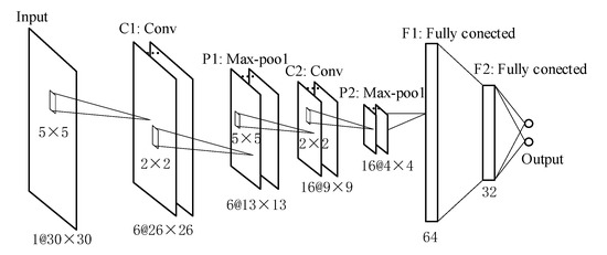 For simplicity without loss of generality, a traditional CNN consists of two convolution-pooling layers (shown in Figure 2), to realize position calculation and verify the effectiveness of the proposed system. The method is simplified in references [38,39]. This CNN consists of two 5×5 convolutional layers (C1 and C2), two max-pooling layers (P1 and P2) with stride 2, and three fully connected layers (F1, F2, F3). The output layer (F3) has two output nodes and each node outputs a corresponding coordinate value.