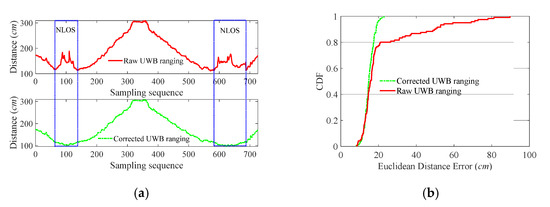 The correction of UWB ranging measurements under NLoS (about 20%), the raw UWB ranging marked with a red line and the corrected UWB ranging marked with a green dash-dotted line. (a) the UWB ranging tests. (b) the Cumulative Distribution Function (CDF) of Euclidean distance errors.