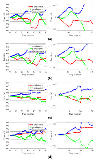 PDR tracking accuracy changes with step number. The figures (a–d) are four different testers’ PDR tracking accuracy.