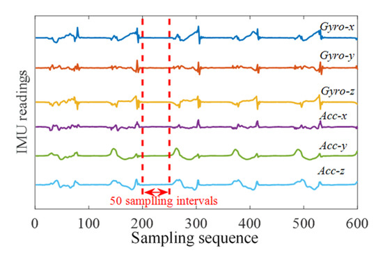 The input size of the CNN relates to the number of APs and the length of sampling sequences. In this paper, only one AP was used to collect a CSI fingerprint in the system. In order to select an appropriate sampling number and keep correlation in sampling sequence (sequential signals are received in a fixed point while the pedestrian is walking), the signal transmission interval and the ground contact time (interval between heel-strike and heel-off) should be considered. As depicted in Figure 6, the tester’s ground contact time of walking (walking speed was about 1.8 m/s, which can satisfy most motion modes in an indoor scenario) had at least 50 sampling periods (500 ms) when the sampling period of the IMU was 10 ms (100 Hz).