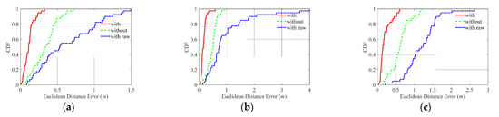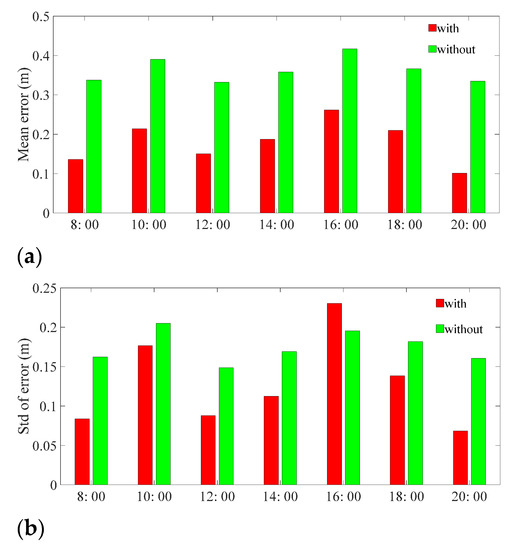 As depicted in Figure 10, the mean localization error of the proposed scheme (‘With’) is lower than that of the CNN directly-predicted results (‘without’) in every time interval, which verifies that the proposed system can reduce the localization error effectively. Moreover, the positioning error of the proposed scheme is lower than 0.25 m and the error of the corresponding CNN prediction scheme (‘without’) is bigger than 0.35 m in all test intervals. Due to people body interference and changes in the tiny environment, the localization error varies with time; it is obvious that the localization system has the maximum positioning error at 16:00 (people are most tightly concentrated in this period of time) and the minimum positioning error at 20:00 (when there is minimal human interference).