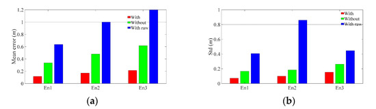 The Euclidean distance between predicted location and true location was used as localization error (m). The corresponding cumulative distribution function (CDF) of the localization errors and comparisons was computed and is given in Figure 8 and Table 4, in which the character(s) ‘With’, ‘Without’, and ‘With raw’ respectively denote calibrated CNN localization result with corrected UWB ranging, without UWB ranging, and with raw UWB ranging. It reflects that the calibrated UWB ranging can considerably improve the CNN-predicted results compared with ‘Without’ and ‘With raw’ schemes. Moreover, the localization performance on mean errors and Standard deviation (Std) are given in Figure 9 and Table 5. Figure 9 and Table 5 indicate that ‘With’ scheme has higher and more stable localization results compared with other schemes in terms of mean error and corresponding Std. It also reveals that the accuracy of UWB ranging is the key to performance improvement. More specifically, raw UWB ranging without correction may incur performance degradation compared with no UWB assisted scheme (‘Without’ scheme), and the high-accuracy UWB measurement can improve the localization performance.