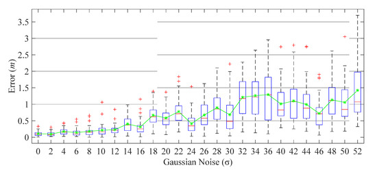 The experimental results depicted in Figure 12 show that the localization system can still keep most of the mean localization error (75%) under 0.5 m, and 1 m when σ ≤ 12, σ ≤ 26. Importantly, the whole localization accuracy is considerably stable (the biggest outliers are no more than 0.7 m) when σ ≤ 8. This experiment shows that the proposed system has a certain degree of anti-noise attack ability.