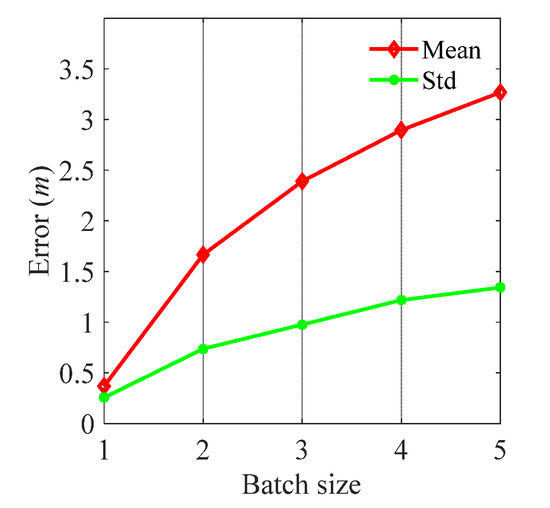 Figure 13 shows that localization errors increase with batch size, and the stability of positioning decreases with batch size (Std increases with batch size). Since the CNN has been fully trained in the initial stage, the mapping parameters of CNN can represent initial environment characteristics. Though the environment has changed in the positioning stage, the mapping parameters of the CNN only need minor adjustment. However, the larger the batch size, the more mapping parameters modification required, which could increase the error of other positioning points. Therefore, the batch size should be set as 1.
