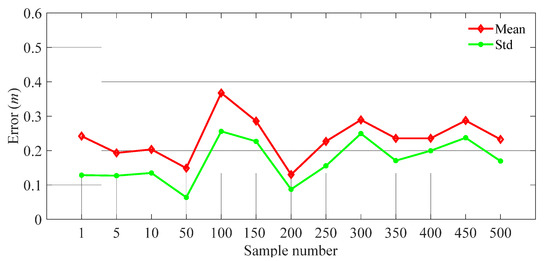 To evaluate the impacts of the sample number on the positioning error, we calculated the localization error using different test numbers as shown in Figure 14. This indicated that the localization error was insensitive to the test number, i.e., the positioning accuracy remained relatively stable (within 0.4 m) when the number of samples increased. Moreover, as shown in Table 6, the update time (i.e., time of giving calibrated results) increased with the sample number. Therefore, the proposed system can realize online learning\calibrating (in the positioning stage) with high position accuracy, and also has the potential to locate multiple people where the sample size is equal to the number of people.