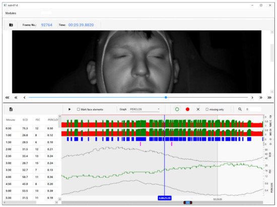 All unclassified frames as well as the automatically detected eye closures could be verified and corrected manually in the window of the result visualisation module, as shown in Figure 2. The upper part of the window displayed a frame of the recorded video material, selected with the cursor on any of the charts presented in the lower part of the window. In this area, automatically detected eye openings and closures were displayed as series of bars, the height of which reflected the degree of eye opening. Eyes classified as open were marked with green bars, while eyes classified as closed were marked with red bars. The previously unclassified eye states were unmarked, resulting in the gaps between the green or red bars. The distributions of these bars along with the successive video frames were presented for the right and left eyes, one below the other. The next chart in the form of a series of blue bars of the same heights indicated the video frames in which the driver’s eyes were open. The gaps between the blue bars indicated frames in which both eyes were qualified as closed. The purple bars below the blue ones indicated frames with ordinary eye blinks, which were not included in the determination of PERCLOS, ECD, and FEC indicators. The next three graphs showed the changes of these indicators along with successive video frames. On the left side of the charts, the average values of the eye closure-associated indicators, calculated within the time periods specified in the software settings, were listed. They could be exported to a comma-separated values (CSV) file.