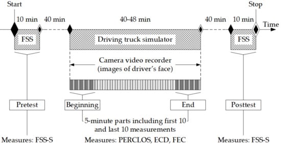 As the subjective measurement of fatigue using the FSS-S scale was taken at two occasions, i.e., before and after completing the simulator task, the averages, i.e., arithmetical means of the first 10 measurements and of the last 10 measurements of PERCLOS, ECD, and FEC, were computed, and those averages were further treated as eye closure-associated indicators in the pre-test/post-test study design. Moreover, the categorical variable of the ‘rested’ or ‘drowsy’ states of the subjects was taken as the main factor describing the experimental conditions.