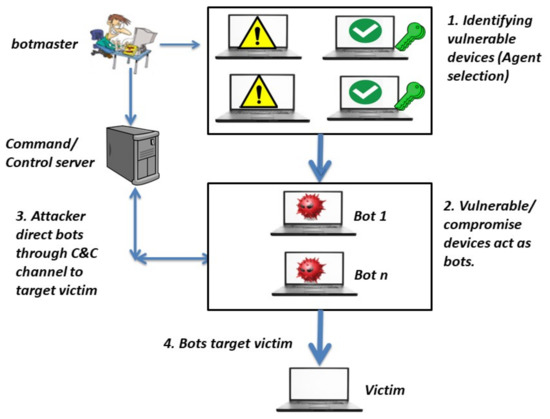 The detection of DDoS attacks is very challenging [2]. DDoS attacks are kind of cyber-attack that target a specific machine or server and lead them to stop providing their services to the devices that are connected to this machine. Attackers in DDoS attacks can form a botnet [1,3]. A botnet is a very large number of malicious devices that are called bots. All of these devices are controlled by a main attacker called a botnet master. A botnet master is responsible for choosing and detecting these compromised devices. Attackers carry out four steps in order to form a botnet. These steps involve identifying vulnerable devices, compromising agents to act as bots, using a C&C channel between the attacker and the bots, and targeting victim using the bots, as shown in Figure 1.