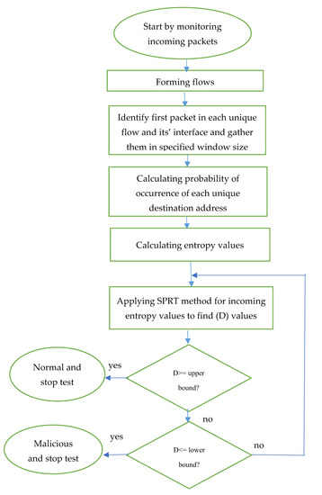 The destination IP addresses of the first packet of each flow are monitored and gathered based on a certain window size. This window size can be determined based on the number of packets or the timeframe. The interface number of the switches (MAC) that allow these flows to pass through will also be recorded in order to locate infected interfaces. These flows will be forwarded towards the entropy stage. The output of the entropy stage is used as the input for the second step, which is SPRT. Finally, a decision can be made for all flows and their interfaces to determine whether they are infected or not at the end of the SPRT detection process. The flow chart for this combination method is shown in Figure 2.