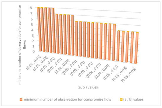 The values of variable (a) and variable (b) should be between 0.01 and 0.05 in order to maintain optimum false positive and false negative values for the detection model. Their specific values are chosen based on calculating the minimum number of observations required to identify compromise flows. Figure 3, shown below, explains how to find the best values for (a) and (b). When (a) is 0.05 and (b) is between 0.01 and 0.05, the minimum number of observations of the detection method required to detect malicious flows is only five observations. Therefore, we set (a) to be 0.05 and (b) to be between (0.01 to 0.05) in the evaluation.