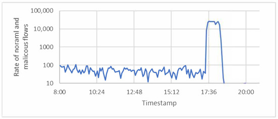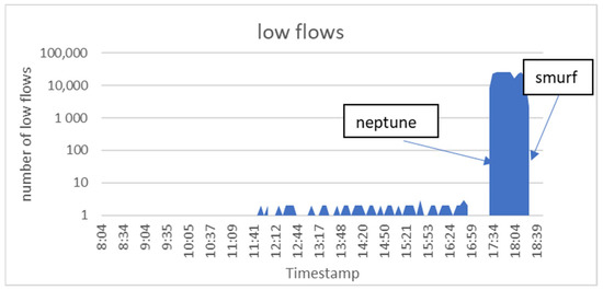 As mentioned earlier, a flow is a group of packets that have the same specifications. Flows can be classified to low flows and normal flows. The number of packets classified as low flows was smaller than three packets. However, the number of packets classified as normal flows was larger than three packets. This is because attackers were trying to overload servers with a very large number of low flows to consume their resources. Back to the Friday_1998 Dataset, there were a very large number of low flows starting to occur at (17:27:07), and this was due to the ‘neptune’ attack. The ‘smurf’ attack also produced a large number of low flows, starting at (18:00:15), as shown in Figure 5.
