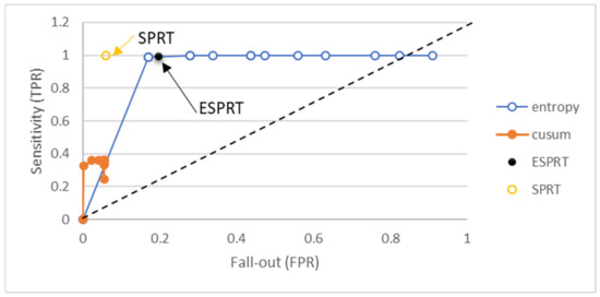 When the values of TPR metrics are close to one and the FPR values are close to zero for a certain detection method, this means the detection is good, and vice versa. The value of TPR for ESPRT was 0.995 and for SPRT it was 0.999. However, entropy and CUSUM have different values of TPR and FPR based on changing threshold values. The FPR value for entropy fell in the range of 0.171 and 0.767, based on change in the threshold values. Thus, entropy detection alone generates higher FPRs, and the FPR value of entropy can be reduced when combined with the SPRT method, as shown in Figure 6.