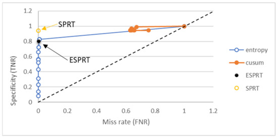 FNR should be closed to zero. FNR was close to zero for ESPRT, entropy, and SPRT. Entropy has different FNR values when the thresholds change, as shown in Figure 7. The TNR value should be close to one for better detection. The TNR for SPRT was 0.940, and ESPRT had a TNR value of 0.802. However, the TNR for entropy fell in the range of 0.08 and 1, based on threshold values. Results for TNR vs. FNR for different methods shown in Figure 7.