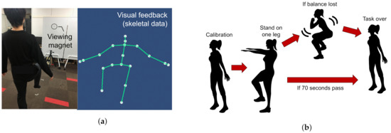 Experiment protocols followed during one-leg standing measurement. (a) One leg stance posture maintained along with the visual feedback given to the user. (b) Different stages of one-leg standing measurement.