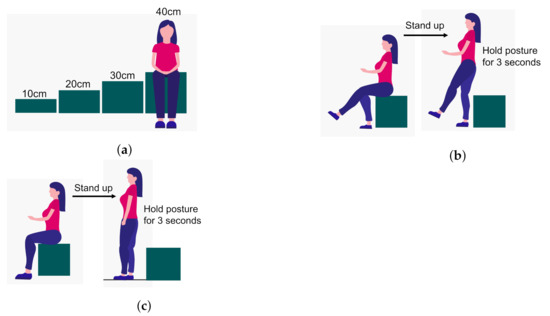 Details of the stand-up test in the form of illustrations [7]. This test is helpful for assessing the subject’s leg strength. (a) Different seat heights (10 to 40 cm) used for the stand-up test. (b) Stand-up test with both legs on the ground. (c) Stand-up test with single leg on the ground.