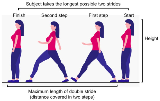 The second parameter is based on a test called the two-step test. This test assesses the subject’s gait stability, balance, and lower extremity musculoskeletal strength. In this test, the subject starts by standing on both legs and then takes two steps forward such that the initially grounded foot is used to finish the leap. The subject has to cover as much distance as possible without losing stability or falling. The total length of the stride is measured from the starting point to the endpoint in centimetres, as shown in Figure 4. This distance is then normalized by dividing the value by the subject’s height in centimetres. The resultant ratio represents the value of the second parameter.