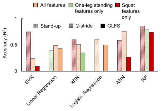 The accuracies of the RF regressor, on the other hand, indicated squat features to be the most suitable choice for predicting stand-up and GLFS-25 scores. One-leg standing features produced the highest accuracy in predicting the 2-stride score. Table 8 shows the best accuracies obtained for the three STBLS scores considering different input feature conditions.