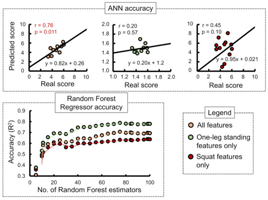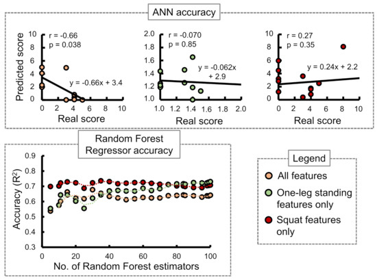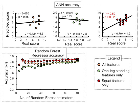 - Stand-up score: Figure 7 shows the ANN and RF accuracies for the stand-up score. The ANN correlation coefficients while considering all input features, one-leg standing features only, and squat features only were observed as 0.07, −0.096, and 0.59, respectively. The best RF regressor accuracy () was obtained while considering squat features only followed by all features and one-leg standing features only.