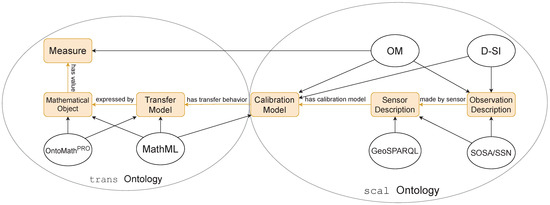 The merging scheme used to generate the trans [31] and scal [30] ontologies from external ontologies and data models. The “Transfer Model” class is an abstraction corresponding to the dynamic transfer behavior of sensors, which is expressed by objects belonging to the Mathematical Object class. The Measure class assigns numerical values to the model parameters.