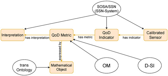 In order to ensure that metrological traceability is a core part of our model, the description of observation values and metrological uncertainty will be carried out using the D-SI model [35] as before, while the OM ontology [36] will be used to model the physical quantities being measured. The traceability of the sensor measurements to the International System of Units (SI) as well as a systematic description of the physical units will thus be ensured. The SSN and SOSA ontologies will be used to model the sensing devices themselves. Moreover, the concepts defined in the SSN system capabilities module [43] will be used to ensure that the applicability of our ontology extends beyond physical sensors to soft-sensors and sensor aggregates. In order to provide a machine-interpretable description of the mathematical concepts required to compute a metric, the “Mathematical Object” class from the trans ontology defined in [31] will be used. The system capabilities extension of the SSN ontology, denoted by ssn-system, describes physical properties such as the survival and operating range as well as system properties such as drift, precision, resolution, and accuracy of a sensor. Through the use of ontologies, the concepts outlined in Section 2 can be systematically described while taking into account the relationships between them. The resulting merged ontology, which we call the qod ontology, is illustrated in Figure 3.