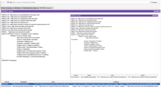 In Figure 4, potential SPARQL queries corresponding to the first two of the above system-specific competency questions are shown. The first query returns the available sensors (MPU9250 and a dummy sensor) in the network with an indicated battery level. The type of interpretation corresponding to the battery level of the metrics is then queried and two different interpretations—battery level and remaining lifetime—are returned. Finally, the battery level of the sensors and the mathematical expression used to convert the raw data values to interpretable numbers (percentage and hours remaining in the present case) are queried and returned. In the inset, the ontology is queried to check which of the sensors have a critical battery level and the dummy sensor is returned as its remaining lifetime (0.5 h) is below the critical minimum threshold of 2 h.