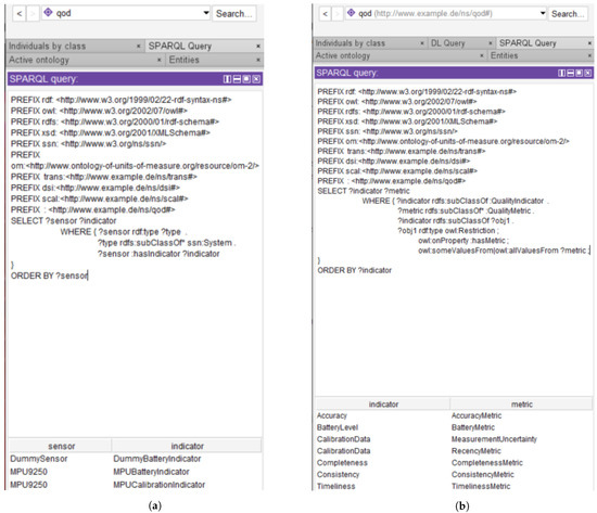 Example SPARQL queries along with their results corresponding to the first two questions are shown in Figure 5a,b. The first figure shows that the MPU9250 has two types of available quality indicators—a battery level and calibration data, while the dummy sensor is only provided with a battery level indicator. In the second case, we see the result of a system-independent query that shows which types of quality metrics are available for each indicator type. The calibration data, unlike the rest, can have both the recency of its calibration and its measurement uncertainty as metrics.