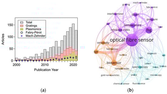(a) Articles as a function of publication year retrieved by searching for optical-fibre sensors. Some representative types of optical-fibre sensors for biomedical applications are depicted. The data were taken from 1351 articles found in Web of Science Core Collection when searching for optical-fibre sensors (23,895 records) and restricting the results applicable to the biomedical field (accessed on 17 September 2021). (b) Map visualization of keywords links strength network using the same 1351 articles information. Only keywords exceeding twenty occurrences are depicted. The period selected is from 1965 to 2021. Abbreviations: magnetic resonance imaging: mri; surface plasmon resonance: spr; fibre Bragg grating: fbg; optical coherence tomography: oct; photonic crystal fibre: pcf. Graph created using VOSviewer software version 1.6.17 [13]. The evolution of published articles over the years and network maps of keywords related to optical-fibre sensors in general (not restricted to the biomedical field) can be found in the supporting information (Figures S1 and S2), including details on how these graphs were generated.