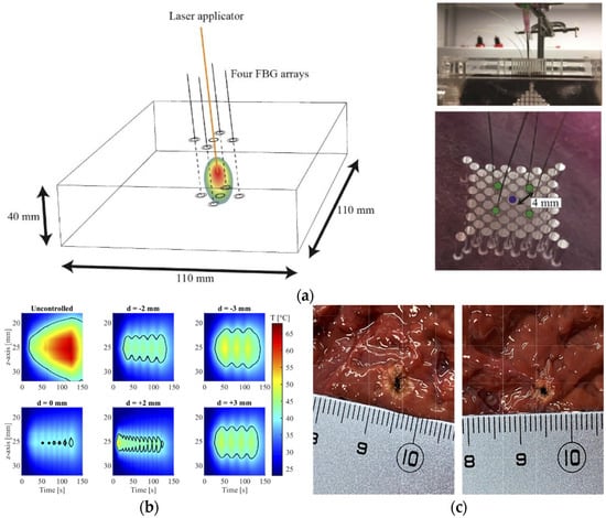 Several works have reported the quasi-distributed monitoring (spatially resolved) of temperature during laser ablation. Real-time monitoring of temperature for laser ablation regulation is not typically considered. In this context, Korganbayev et al. reported a closed-loop temperature control (spatially resolved) system for monitoring the temperature of ex vivo liver tissue during laser ablation [40]. It included highly dense FBG arrays that were inscribed in polyamide-coated single-mode-fibres. The device demonstrated control of the tissue temperature during contactless irradiation in the desired area. Nevertheless, this proof of concept was limited to a superficial treatment, and contactless irradiation is not an actual situation in clinical settings [42]. Hence, later, Orrico et al. moved towards a real application of laser ablation [42]. The control system comprising quasi-distributed FBG sensors (spatial resolution of 1.2 mm and thermal sensitivity of (7.43 ± 0.01) × 10−6 °C−1) was used interstitially (contact modality), including a simulation-based pre-plan model. The system allowed the margins of ablated zones to remain under critical temperature values (Figure 3). Finally, the strategy enabled the laser-induced temperature increase to be confined with higher accuracy in areas where sensors were located in the beam propagation direction [42]. In the context of laser ablation application, a different study reported the thermal properties of some ex vivo tissues (liver, brain, and pancreas) as a function of temperature [43].