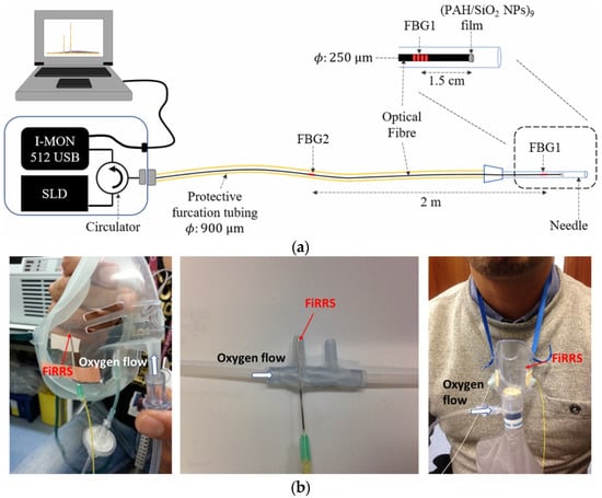 Monitoring of respiratory rate is critical for the clinical care of patients, especially after surgery. Respiratory failure after surgical procedures can be significant (3.4%) in patients following an epidural and general and spinal anaesthetics [47]. In general, respiratory rate measurement is more challenging than that of heart rate, blood pressure, and oxygen saturation [47]. In this context, a novel system including FBGs to measure reflected signal for breathing and humidity sensing films (PAH/SiO2 NPs deposited at the tip of optical fibre) was developed by Sinha et al. in 2021 (Figure 4) [47]. The sensor was used in 15 healthy volunteers and differentiated between normal and low tidal volumes (p-value < 0.05). Such a study demonstrates that sensing reflectance techniques with optical fibres exhibit similar accuracy to capnometry and could be suitable for some oxygen delivery devices, i.e., for portable and continuous monitoring of respiratory rate.