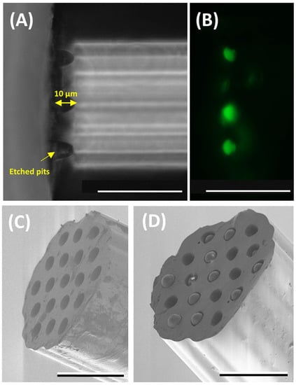 Optrode fabrication and characterisation. (A) Bright-field image of a fibre (viewed from the side) with etched pits (~10 µm in depth). (B) Fluorescence image (excitation 488 nm and emission 520 nm) of the etched fibres (viewed from the side) after the pH sensors (fluorescein-based) were loaded into the pits. Note the focal plane of the image in (B) is different from (A) to highlight the loaded cores. (C,D) SEM images of an etched optical fibre before and after the addition of the microspheres. The scale bar in all the images is 50 µm. The images and caption were taken from their original created by Choudhary et al. [79] under a Creative Commons Attribution 4.0 Unsorted license.