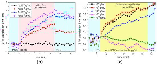 (a) Sketch of the gold-coated fibre used to detect HER2 molecules (in red) through SPR, with antibody amplification in a sandwich configuration (in green). Thiolated aptamers are immobilized on the gold surface to target HER2. (b) SPR-dip minimum shift as a function of time in phosphate buffer saline (PBS), HER2 proteins, and PBS after the immersion in HER2 solution. (c) SPR-dip minimum shift as a function of time in PBS, in antibodies (anti-HER2), and in PBS after amplification. Each curve represents one probe per test. Reprinted (adapted) with permission from [92].