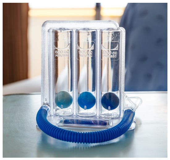 - Craven, J.L.; Evans, G.A.; Davenport, P.J.; Williams, R.H.P. The evaluation of the incentive spirometer in the management of postoperative pulmonary complications. Br. J. Surg. 1974, 61, 793–797. [Google Scholar] [CrossRef] [PubMed]