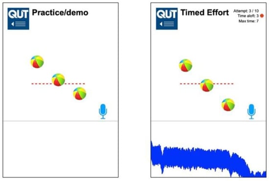 From its inception, incentive spirometry was designed as a motivational affordance to encourage mucus clearance from the airways using repeated slow gradual maximal inspirations (Figure 1) []. An emergent role for ISy therapy has recently been proposed in pulmonary rehabilitation for convalescing SARS-CoV-2 (i.e., COVID-19) patients. []. In contrast to existing clinical incentive spirometer devices that levitate spheres or pistons in response to maximal inspiration, the new QUT Inspire smartphone application is an exertion-type exergame for the detection of inspiratory sound generated at the mouth using the smartphone microphone (without the need for any mouthpieces or other add-on components) []. The application displays an animated graphic on the screen to provide a responsive, visual incentive to persist with gradual, sustained, repeated inspirations (Figure 2). QUT Inspire is an exemplar of an exergame where a game is built into the interface, with a primary goal of keeping animated balls aloft by means of detecting inspiratory sound, and a secondary goal of encouraging sustained gradual maximal inhalation for mucus dislodgement from the airways and expulsion by coughing []. It has been argued that a safe and effective exergame must support primary and secondary goals defined for a therapeutic exercise to be safe and effective for patients [].