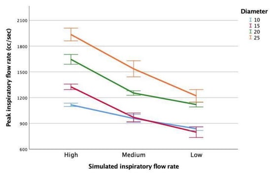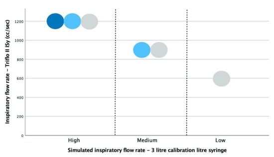The association of flow rate and mouth diameter with the observed peak inspiratory flow values was found to be significant (F2,177 = 553.381, p < 0.01), explaining 86.1% of the observed variability in peak inspiratory flow rate (adjusted R2 = 0.861). Both flow rate (ßflow rate = −0.623, p < 0.01) and mouth diameter (ßmouth diameter = 0.689, p < 0.01) contributed to the variability observed in this model. See Supplementary Materials file for the regression model. The highest simulated peak inspiratory flow rates were produced using higher mechanical syringe-simulated inspiratory flow rates (e.g., high) and application of larger mouth diameters (e.g., up to 25 mm).