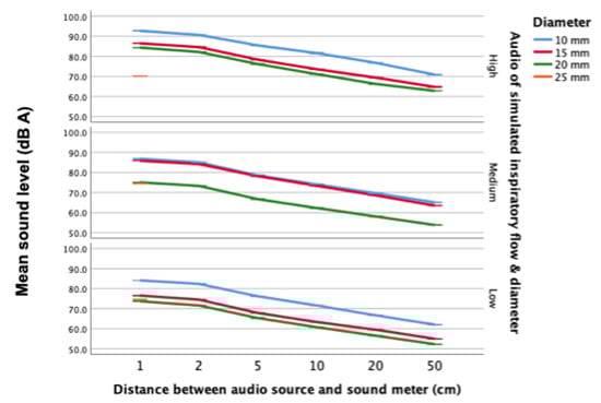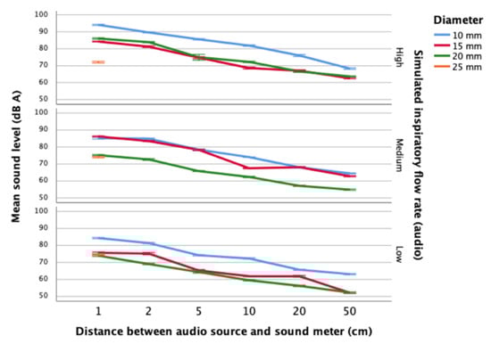 Distance (ßdistance = −0.706, p < 0.00) explained more than twice the variability in sound levels compared with either flow rate (ßflow rate = −0.374, p < 0.01) or mouth diameter (ßmouth diameter = −0.398, p < 0.01). The highest peak inspiratory flow rates were measured when large mouth diameters (e.g., up to 25 mm) were applied using the pneumotachograph (Figure 4). Conversely, the highest sound levels arising from syringe-simulated inspirations were detected where the smallest mouth diameters (e.g., 10 mm) were used (Figure 5). Minimising the distance from the simulated “mouth” nozzle contributed more to producing higher and more audible inspiratory sound, with high syringe-simulated inspiratory flow rates and small mouth diameters also contributing to louder inspiratory sound for detection.