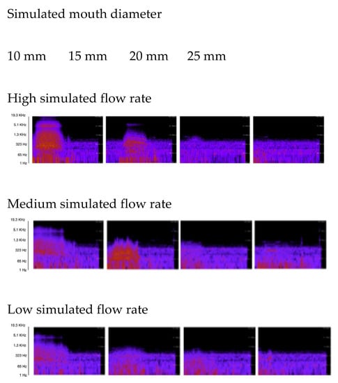 Considering the largest simulated mouth diameters (i.e., 20 and 25 mm), a clearly delineated spectral peak (or perceptible sound) was difficult to identify. A representative sample of each mechanically simulated flow rate and mouth diameter combination was selected for testing the new QUT Inspire app.