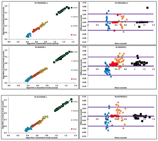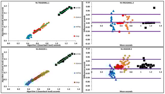 Agreements between A1 and A2 for variability and asymmetry temporal parameters were poor. There were small ADs in mean stride, stance, swing, and step times for YA (0.017 s, 0.029 s, 0.014 s, 0.010 s), OA (0.002 s, 0.009 s, 0.003 s, 0.009 s) and PD (0.015 s, 0.022 s, 0.004 s, 0.010 s), respectively. Absolute agreement for temporal characteristics during indoor walking were highest in YA and lowest in PD. Comparing overall AD and correlation coefficients between stride-step parameters and stance-swing parameters revealed larger differences and lower correlation coefficients in the latter.