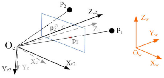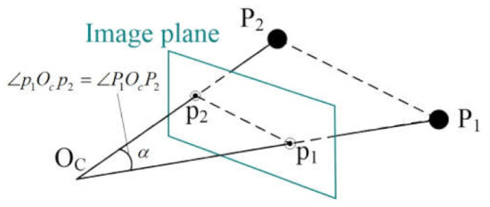 Here, K is a 3 × 3 camera calibration matrix that contains the focal length information. R and t, which contain all the pose information, are respectively a 3 × 3 rotation matrix and a 3 × 1 translation vector from the world frame to the camera frame. Our problem is to estimate R, t, and the focal length f from two 2D–3D point correspondences. Next, we propose our method to estimate the focal length and absolute orientation with angle constraints.